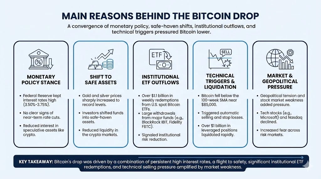 The Bitcoin fall in January 2026 was driven by ETF outflows, Federal Reserve policy, capital shift to precious metals and technical breakdowns. The price dropped from above 90,000 dollars to near 82,000 dollars in a single day. This created fear but also renewed debate about long term opportunity.