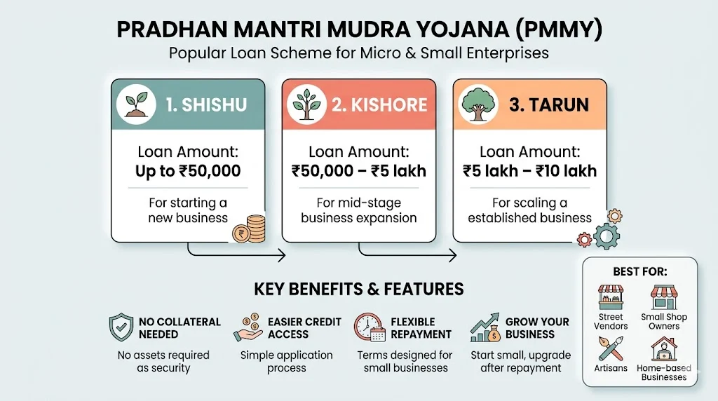 No collateral needed. Many people start small and then upgrade loans after repayment. This scheme is mainly designed for micro and small entrepreneurs who are either starting a new business or expanding an existing one. It is especially useful for street vendors, small shop owners, service providers, artisans, and even home-based businesses. First-time entrepreneurs who don’t have assets to offer as security can benefit the most from this scheme.