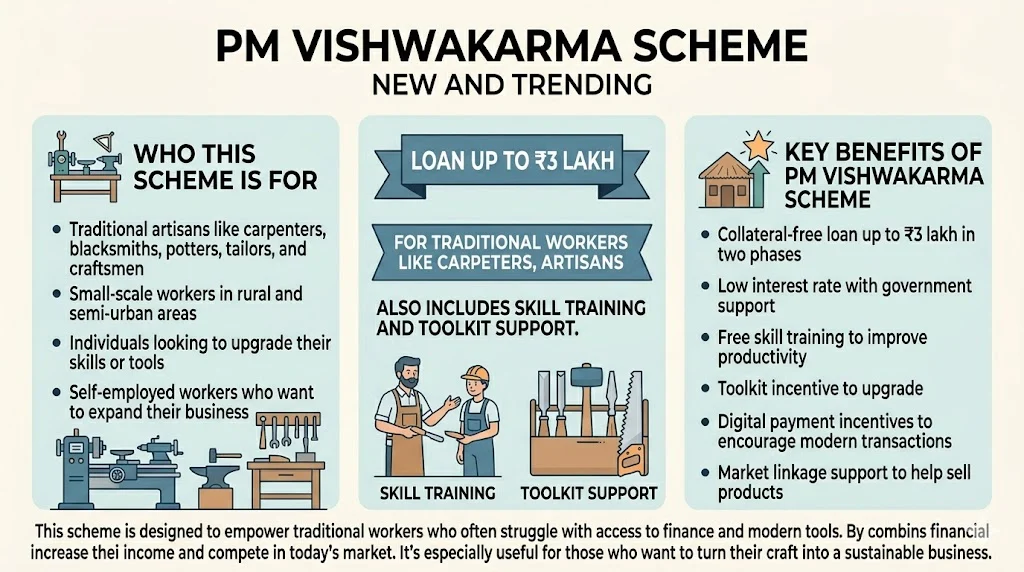 This scheme is designed to empower traditional workers who often struggle with access to finance and modern tools. By combining financial support with skill development, it helps artisans increase their income and compete in today’s market. It’s especially useful for those who want to turn their craft into a sustainable business.