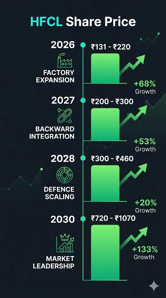 The year 2030 represents the culmination of HFCL’s current strategic initiatives, with the company positioned as a major telecom infrastructure and defence electronics player in India.