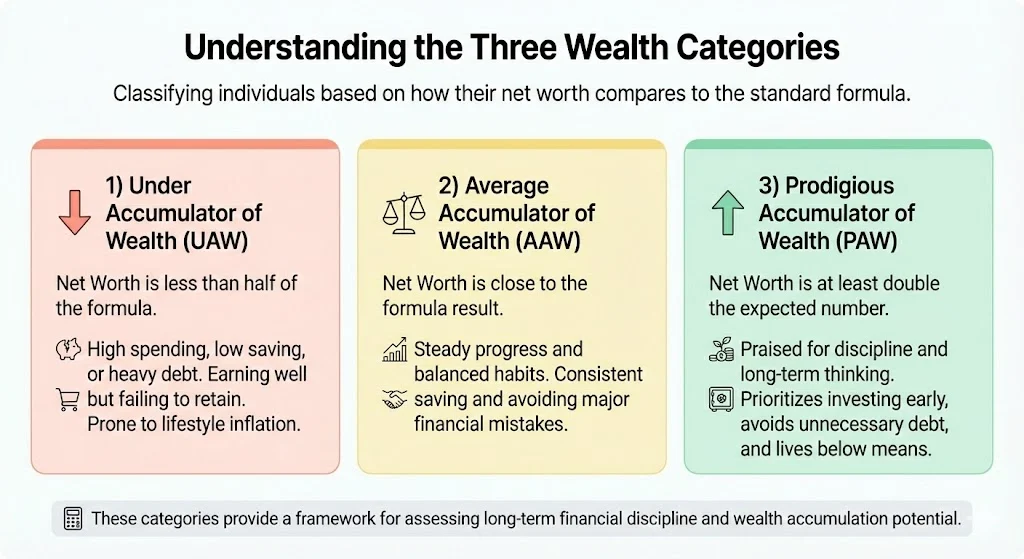An Average Accumulator of Wealth has a net worth close to the formula result. This indicates steady progress and balanced financial habits.
